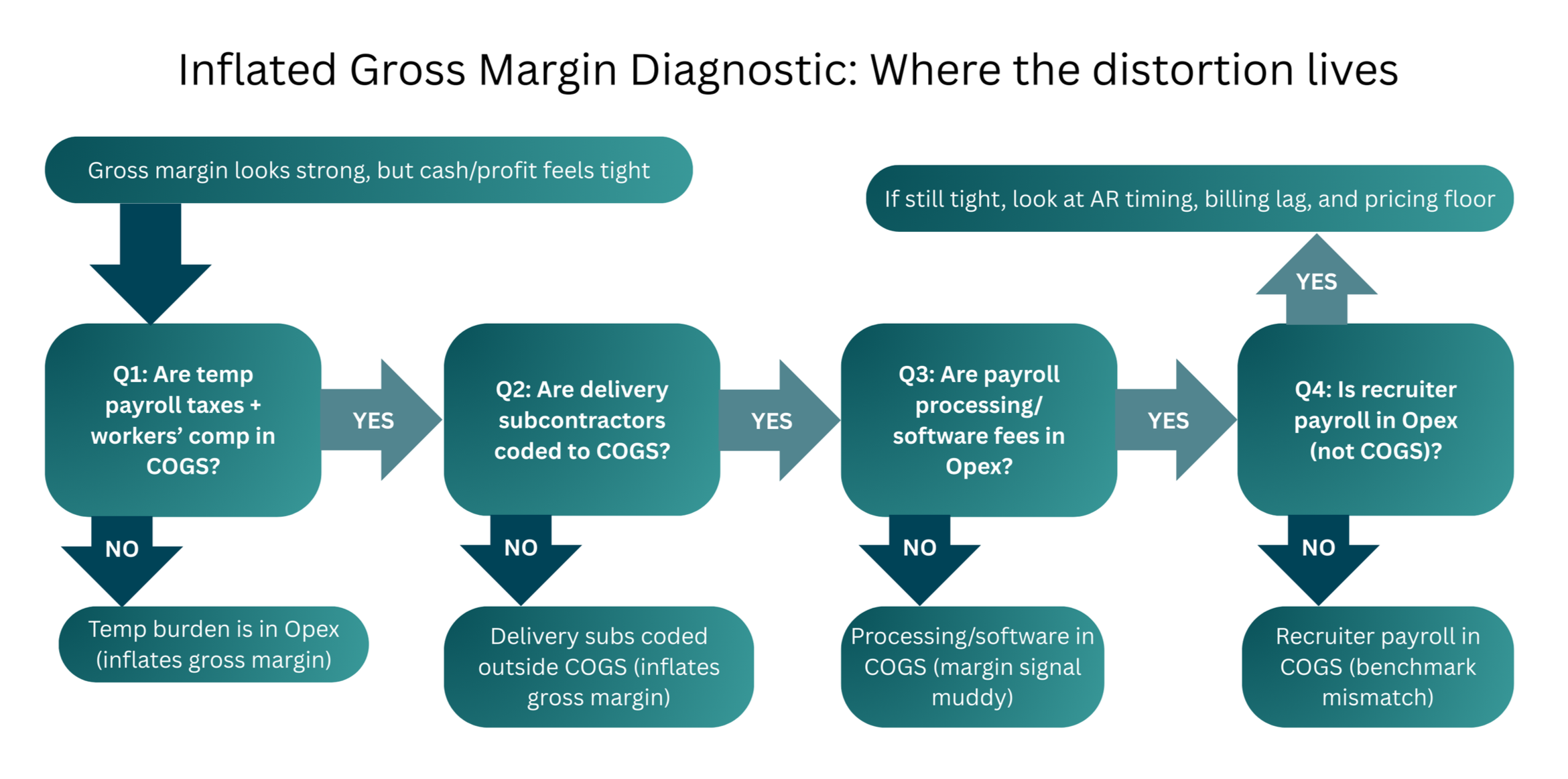 What happens: gross margin becomes distorted and stops matching staffing industry benchmarks.