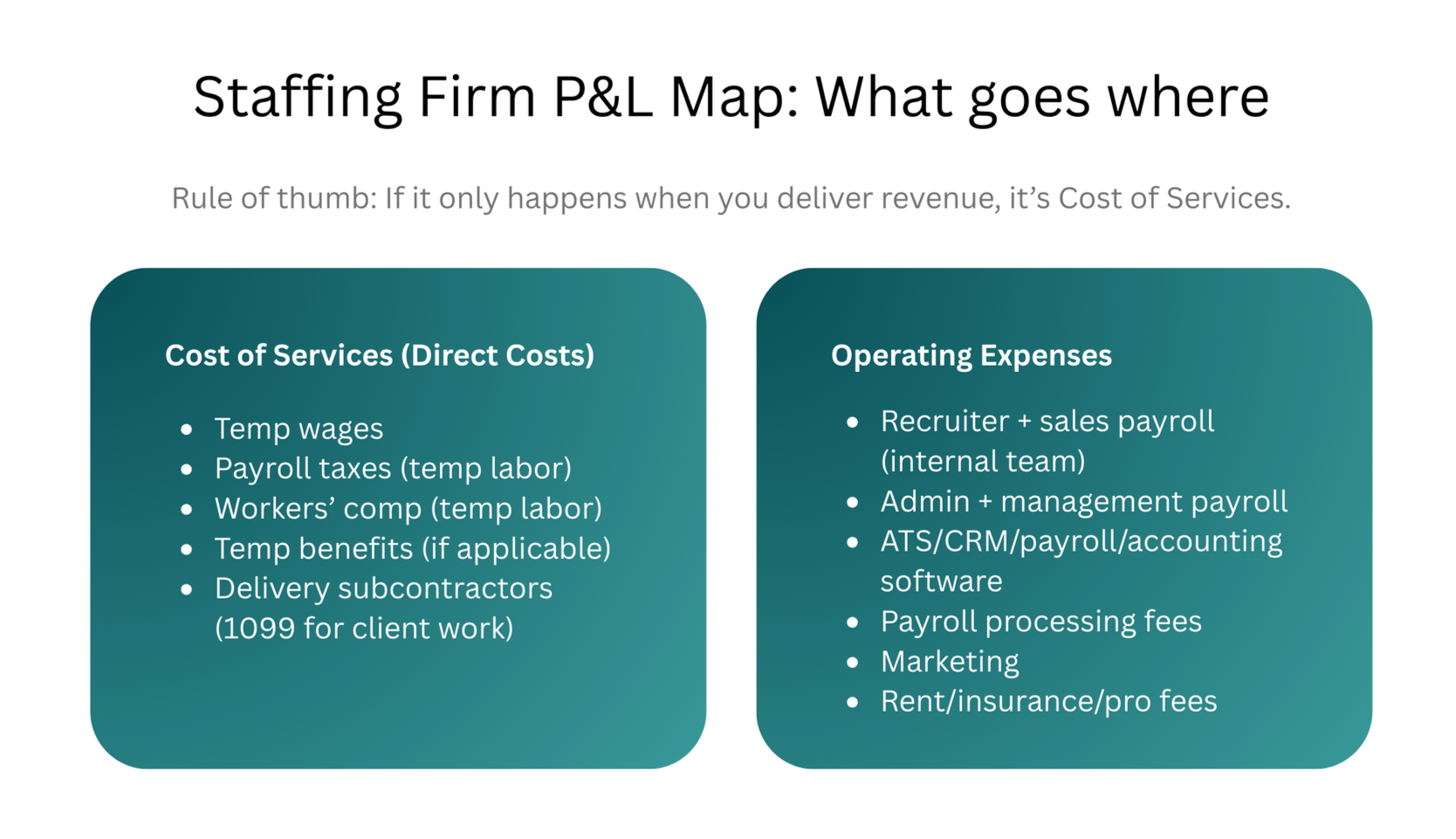 What belongs in staffing firm COGS vs operating expenses