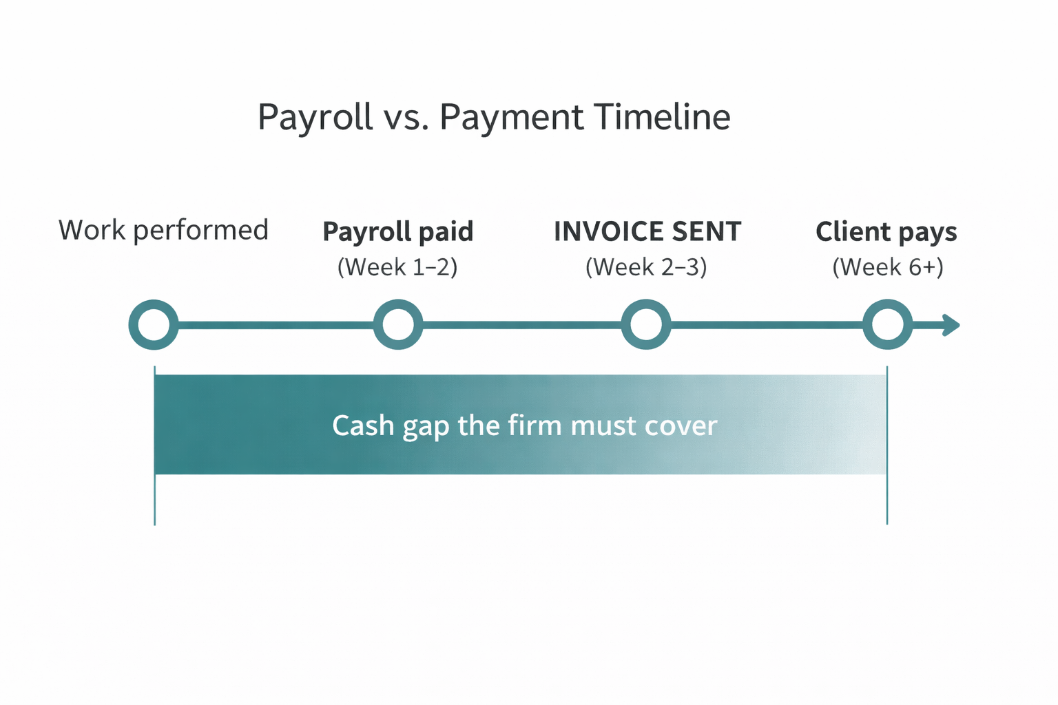 When you add placements or increase hours, your payroll outflow grows immediately. But the cash inflow from those placements does not show up until the invoicing and payment cycle completes.